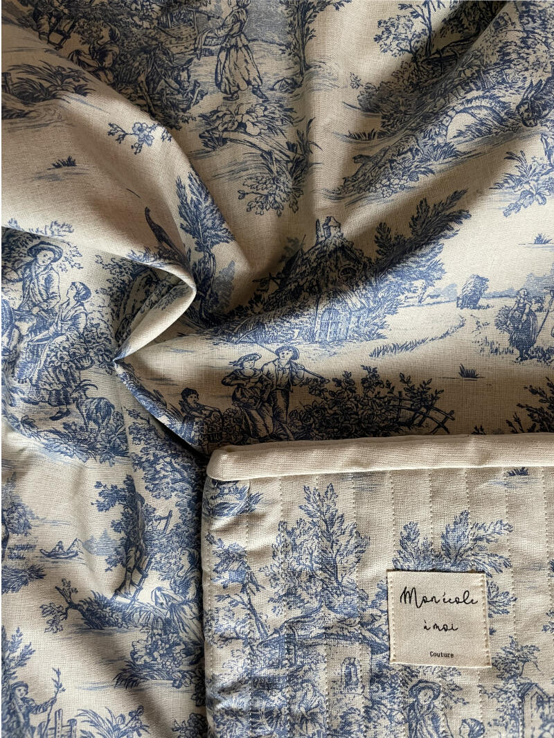 Cette housse élégante en toile de jouy bleue protège vos livres, iPads et liseuses. Confectionnée avec soin, elle combine beauté et praticité pour tous vos appareils de lecture.